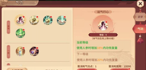 3、气功点数有限,加点顺序有讲究气功的升级,需要消耗“气功点”,而气功点的获取,主要通过角色升级,所以点数非常宝贵,绝对不能乱加,这里有个,通用的原则,那就是“先核心,后辅助”,什么是核心气功?就是对你,当前阶段提升最大,最符合你,发展路线的那个,比如刀客前期,肯定优先点满,“力劈华山”来加攻击,等核心气功满了,再考虑去点,那些增加命中,或少许防御的辅助气功,同时,也要注意,气功的成长性,有些气功,每级提升很小,性价比不高,就要往后放。