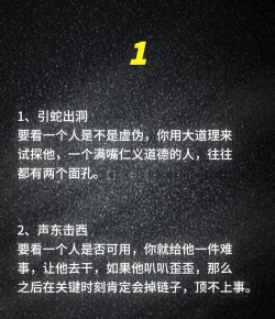 3、测试其真实动机与底线想知道一个人的真面目,可以适当测试,比如,提出一个需要他付出的小请求,观察他的反应,或者,在涉及利益分配时,看他的选择,伪装者往往在利益面前,最容易露出马脚,当然,测试要巧妙,别让对方察觉。