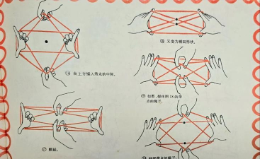 学会了起手式,就可以玩单人翻花了,比如“五角星”,从“降落伞”开始,用拇指去勾小指那边的线,然后,小指松开,接着,再把小指穿进拇指的圈里,慢慢调整,一个五角星就成型了,过程需要一点耐心,但成功了会很有成就感。