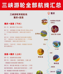 再看路线三峡游轮路线很多,常见的是重庆到宜昌,也有宜昌到重庆,这是经典航线,沿途风景很美,比如瞿塘峡,巫峡,西陵峡,你还可以选择不同天数,比如四天三晚,或五天四晚,时间长短,停靠景点也不同。