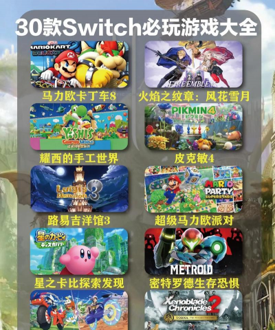说到必玩,塞尔达传说旷野之息,绝对是首选,它的世界太自由了,你可以爬山,可以做饭,还能解谜,然后,是集合啦动物森友会,这款游戏很治愈,你可以建设小岛,和动物邻居聊天,接着,是超级马里奥奥德赛,它充满了惊喜,每个关卡都设计巧妙,是斯普拉遁3,也就是喷射战士,它对战很刺激,画面也鲜艳。