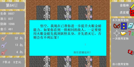 游戏里有很多道具,比如飞行器,可以穿越障碍,还有圣水,能回复生命,遇到商店时,仔细看看,卖什么,价格是否合适,有时候存钱,买高级装备,比零散提升,效果更好。